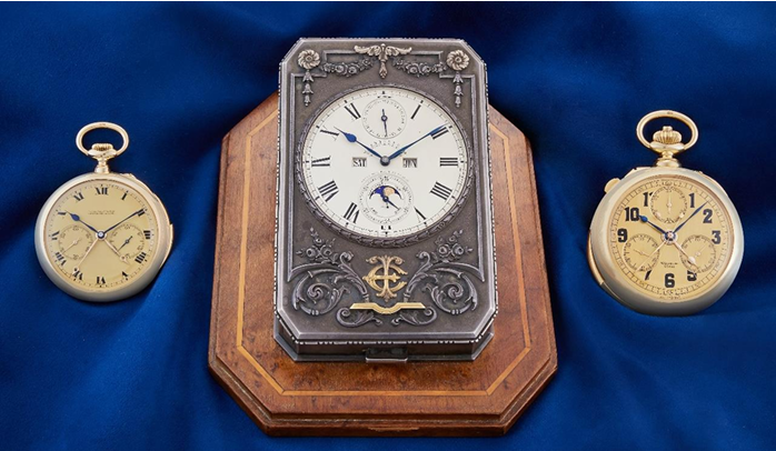 De izquierda a derecha: Patek Philippe Open-Faced Minute Repeater with a Double Movement, 1921, (est. $300,000 – 500,000), Patek Philippe Paper Weight Clock, circa 1927, (est. $500,000 – 1 million) and Patek Philippe Double Movement Minute Repeating Watch, 1924, (est. $500,000 – 1 million)