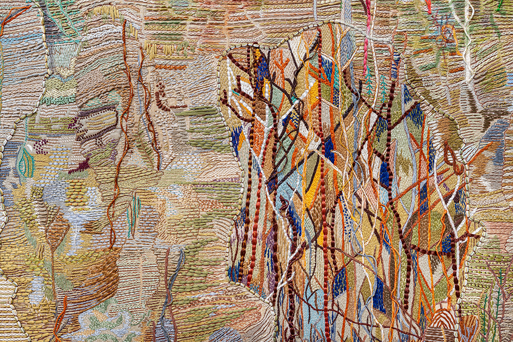 A lo largo del recorrido, el espectador se adentra en espacios que evocan cuevas, ruinas y jardines encantados, en un juego de escalas y texturas que remite tanto a la tradición de los jardines barrocos italianos como a las decoraciones rocaille del siglo XVIII y a la tradición de las grutas artificiales. El trabajo minucioso y paciente de la artista, caracterizado por una atención extrema al detalle, se despliega aquí mediante una combinación de materiales y técnicas —desde el cartón tallado hasta el bordado, pasando por la escultura— que refuerzan la dimensión sensorial y envolvente de la propuesta.